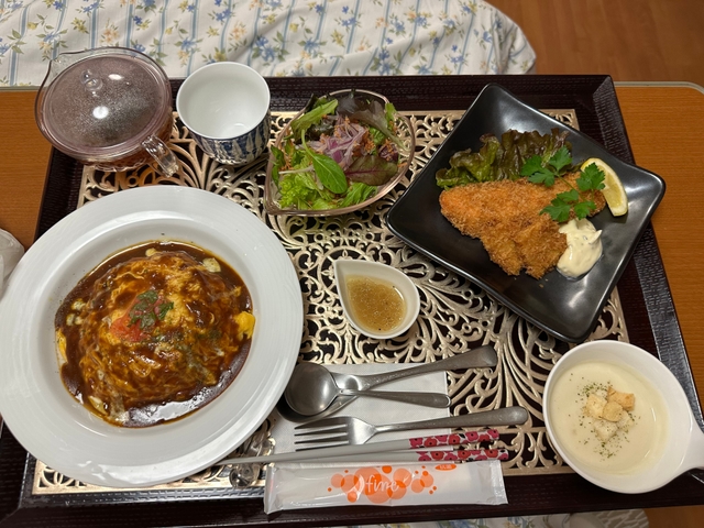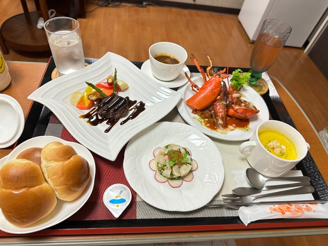 毎食豪華な食事でした。お魚料理とお肉料理両方とも食べれて副菜もたくさんあり、食事の時間がたとても楽しみでした! 初めてのお産でわからないことだらけだったけど先生方や助産師さん方とてもいい方ばかりですごく心強かったです。